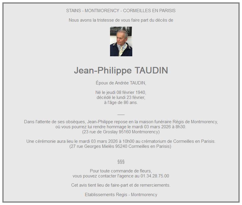 Cet espace « condoléances » est dédié à la mémoire de Monsieur Jean-Philippe TAUDIN.
