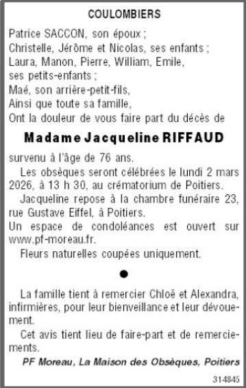 Cet espace « condoléances » est dédié à la mémoire de Madame Jacqueline SACCON née RIFFAUD.