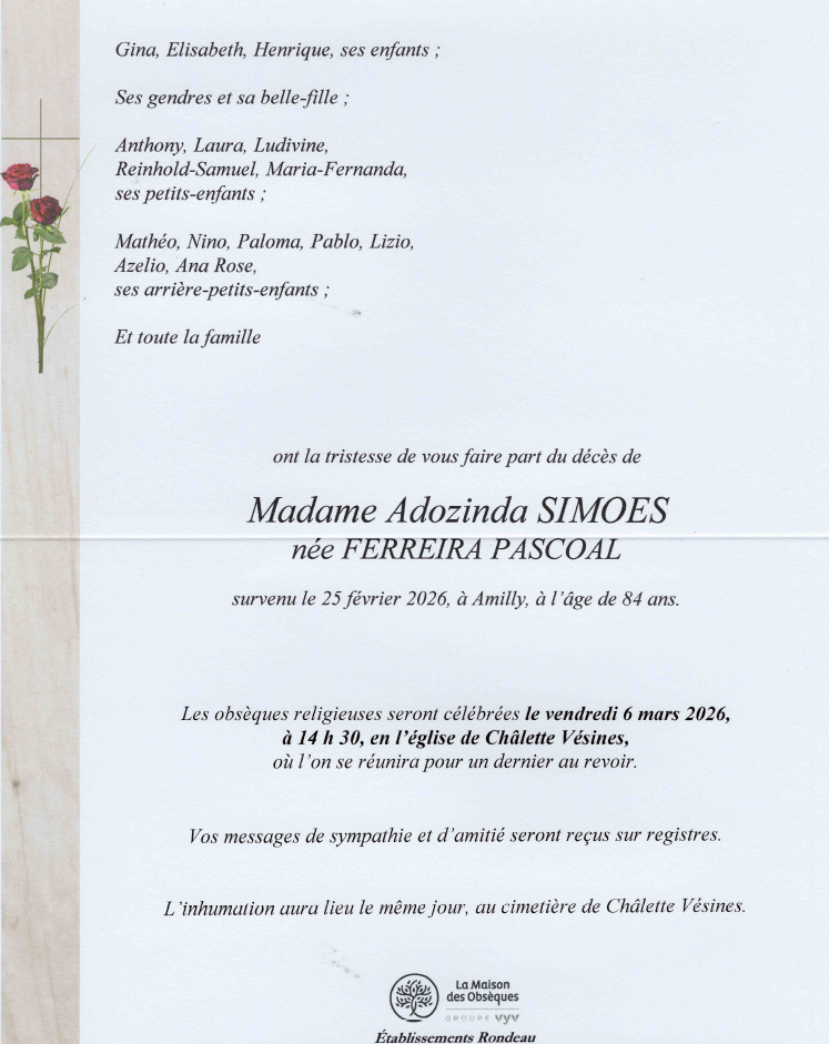 Cet espace « condoléances » est dédié à la mémoire de Madame Adozinda SIMOES née FERREIRA PASCOAL.