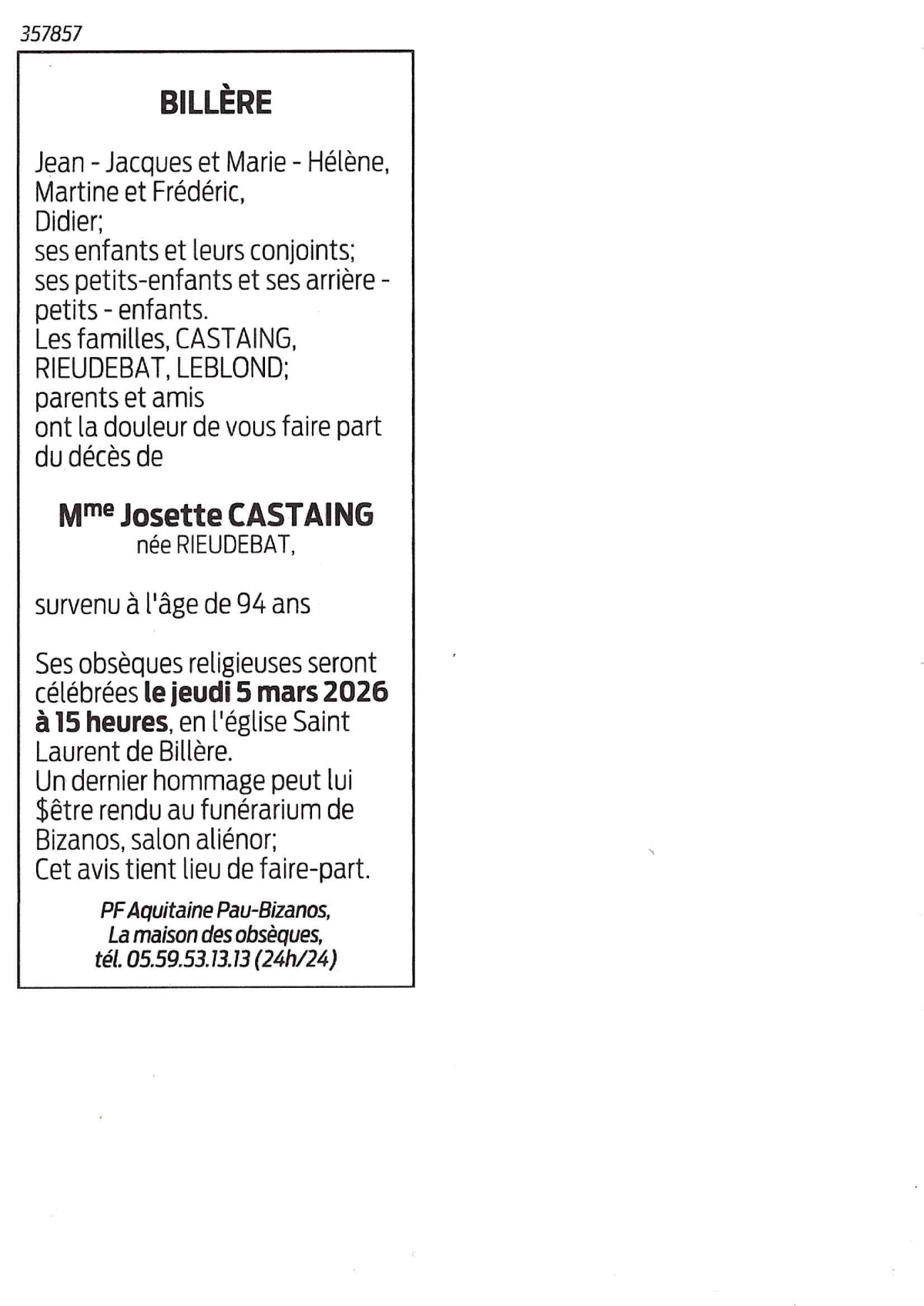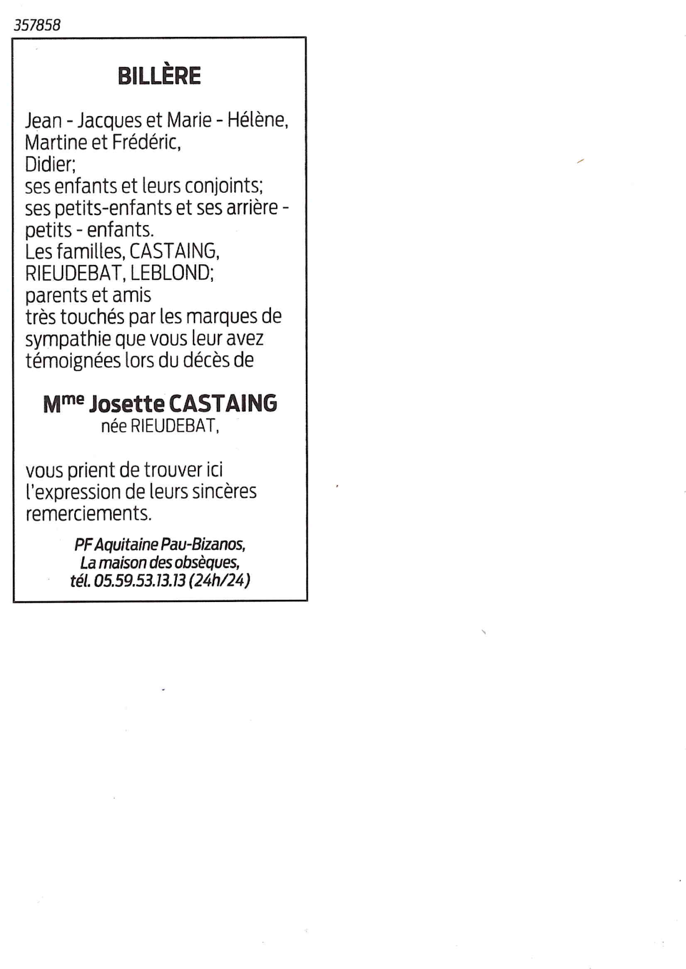 de Madame Josette CASTAING née RIEUDEBAT