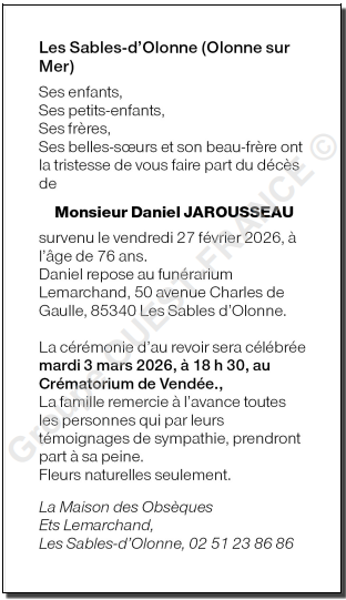 Cet espace « condoléances » est dédié à la mémoire de Monsieur Daniel JAROUSSEAU.