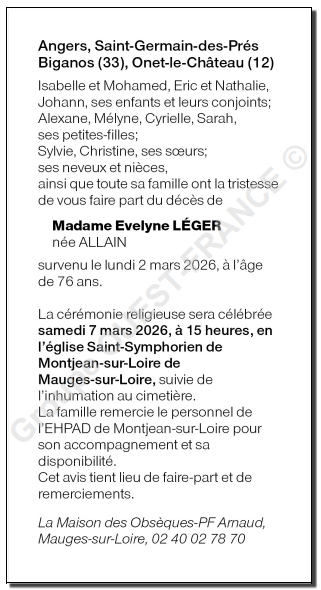 de Madame Evelyne LÉGER née ALLAIN
