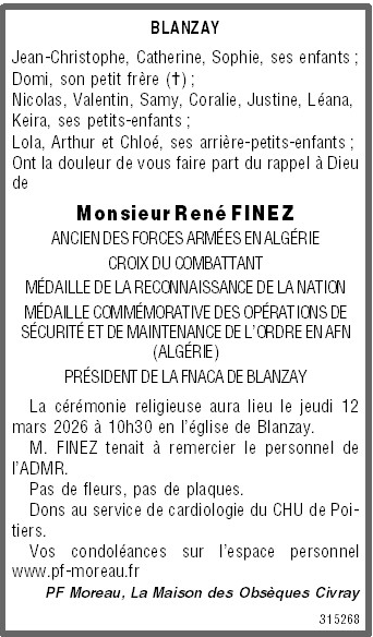 Cet espace « condoléances » est dédié à la mémoire de Monsieur René FINEZ.