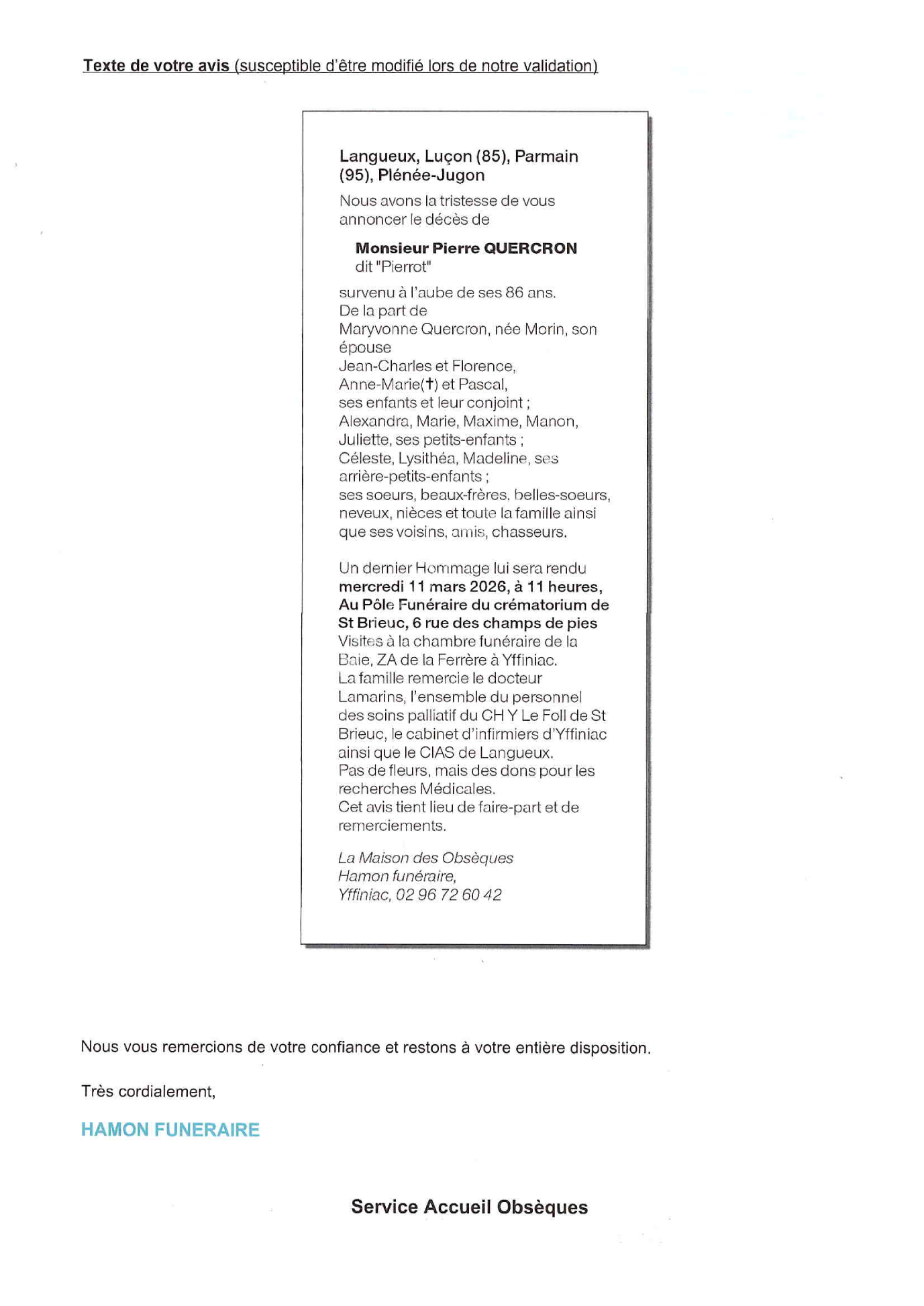 Cet espace « condoléances » est dédié à la mémoire de Monsieur Pierre QUERCRON.