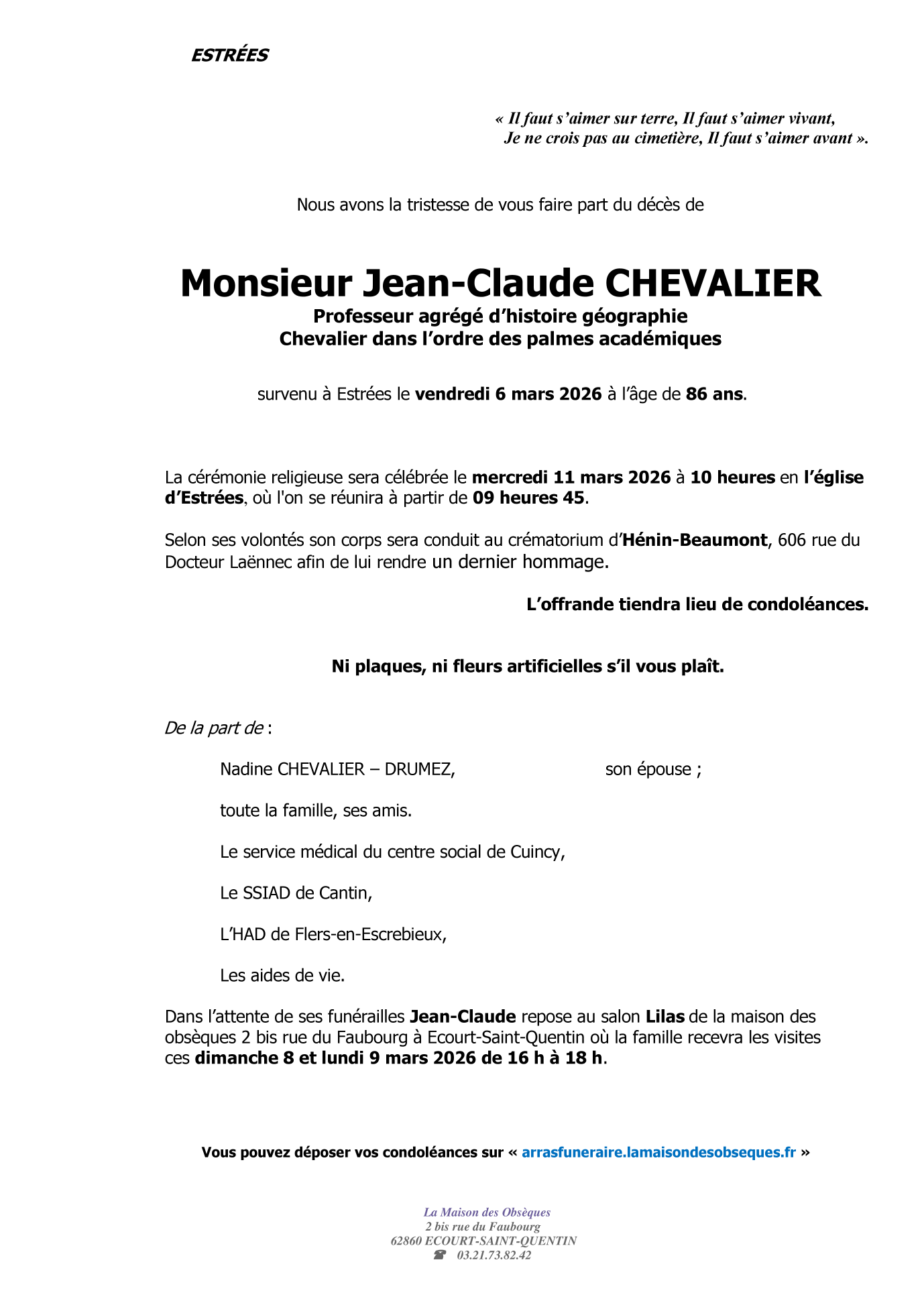 Cet espace « condoléances » est dédié à la mémoire de Monsieur Jean-Claude CHEVALIER.