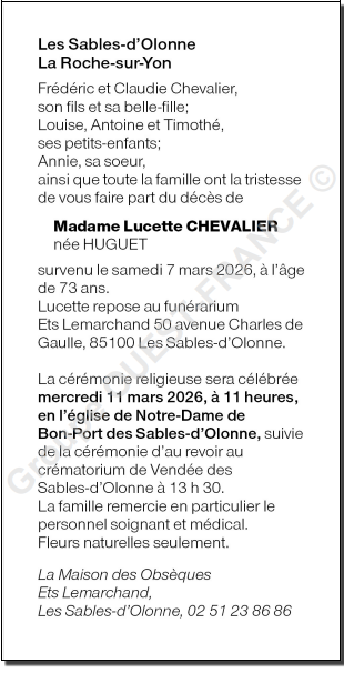 Décédée à Les Sables d'Olonne (85340) le samedi 7 mars 2026
