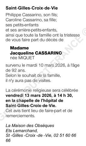 Décédée à Saint-Gilles-Croix-de-Vie (85800) le mardi 10 mars 2026