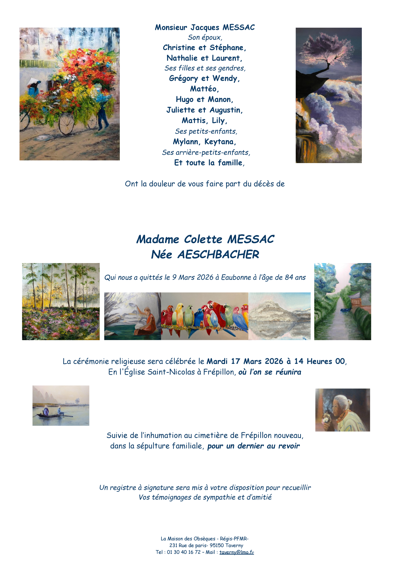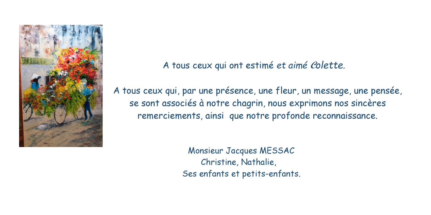Cet espace « condoléances » est dédié à la mémoire de Madame Colette MESSAC née AESCHBACHER.