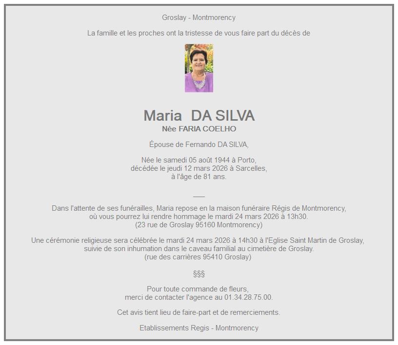 de Madame Maria DA SILVA née FARIA COELHO