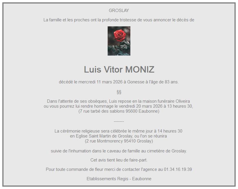 Cet espace « condoléances » est dédié à la mémoire de Monsieur Luis Vitor MONIZ.