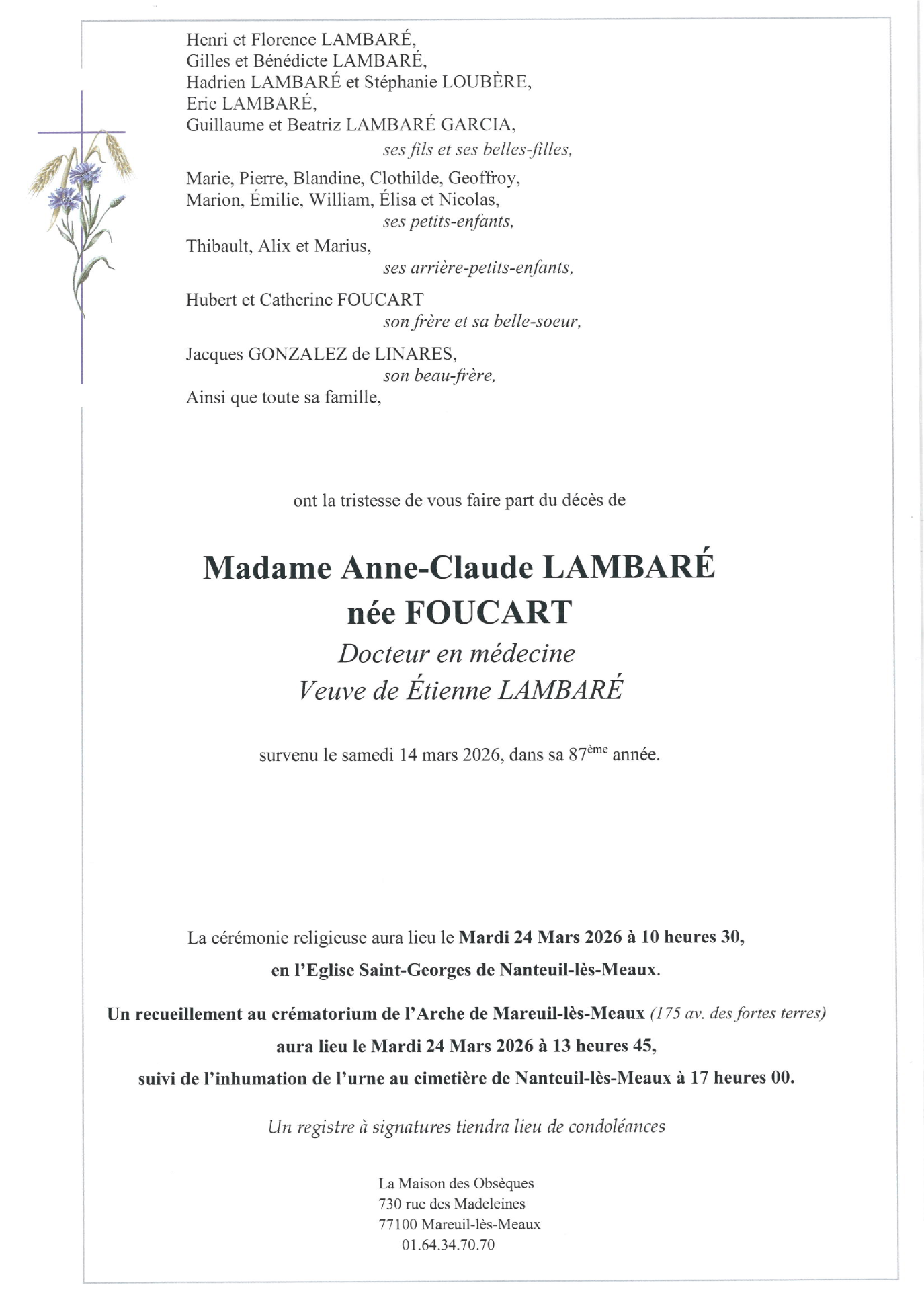 de Madame Anne LAMBARÉ née FOUCART