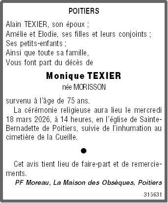 Cet espace « condoléances » est dédié à la mémoire de Madame Monique TEXIER née MORISSON.