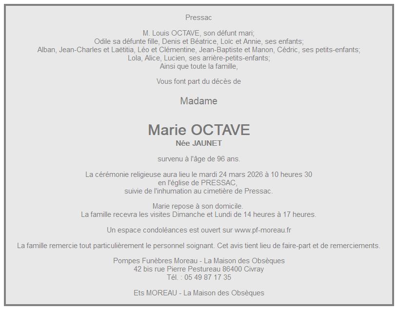 Cet espace « condoléances » est dédié à la mémoire de Madame Marie OCTAVE née JAUNET.