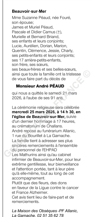 Décédé à Beauvoir-sur-Mer (85230) le samedi 21 mars 2026
