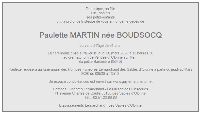 C'est avec une profonde tristesse que nous avons appris le décès de Mme Martin. Elle laissera un grand vide à Bulson. Nous partageons votre peine en ce moment si difficile et douloureux. Paulette pensait toujours à nous et nous envoyait régulièrement une carte, pendant ses vacances et en fin d'année. Nous pensons et penserons toujours à elle, qui était la gentillesse personnifiée.