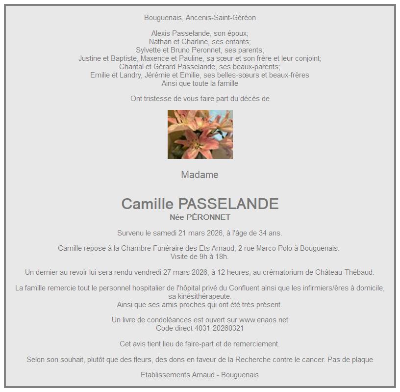Cet espace « condoléances » est dédié à la mémoire de Madame Camille PASSELANDE née PÉRONNET.