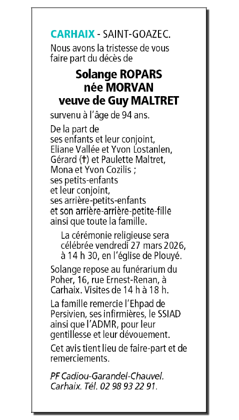 de Madame Solange ROPARS née MORVAN