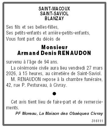 Cet espace « condoléances » est dédié à la mémoire de Monsieur Armand RENAUDON.