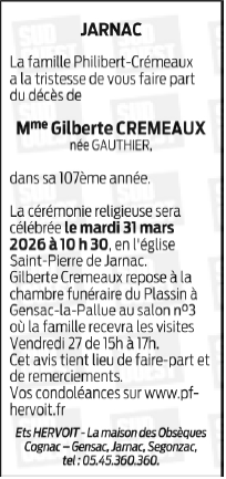 de Madame Gilberte CREMEAUX née GAUTHIER
