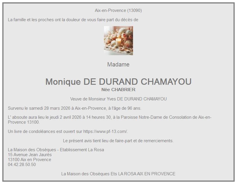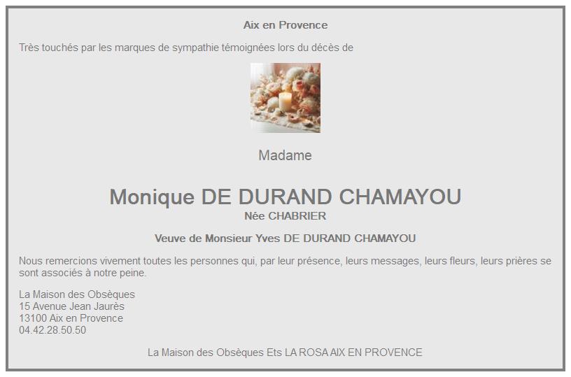 de Madame Monique DE DURAND CHAMAYOU née CHABRIER