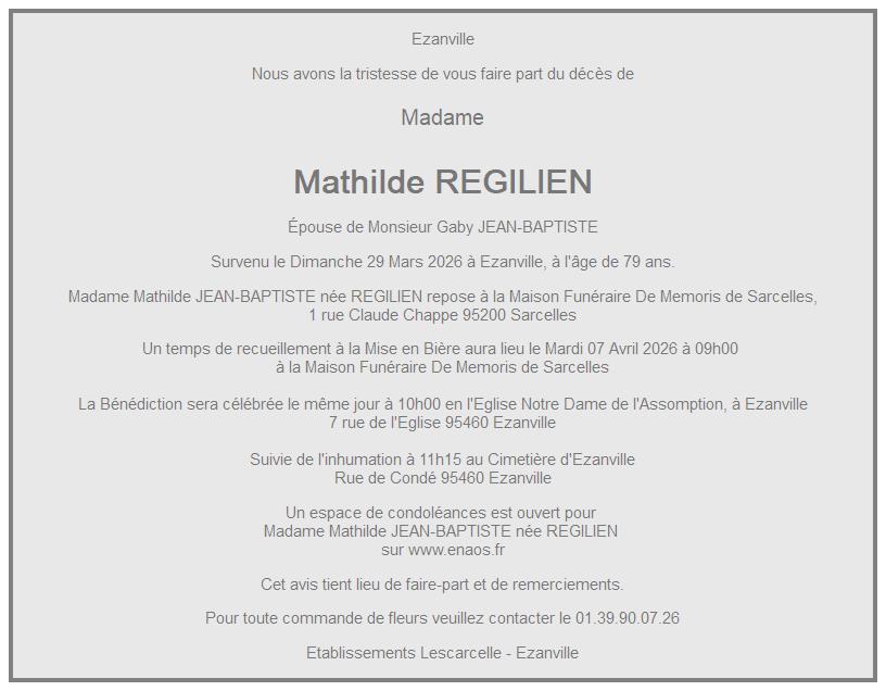 de Madame Mathilde JEAN BAPTISTE née REGILIEN