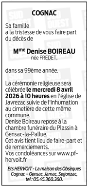 Cet espace « condoléances » est dédié à la mémoire de Madame Denise BOIREAU née FREDET.