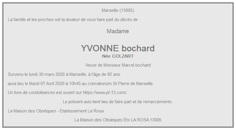Décédée à Marseille (13005) le lundi 30 mars 2026