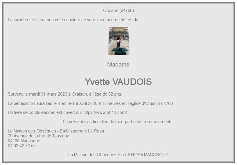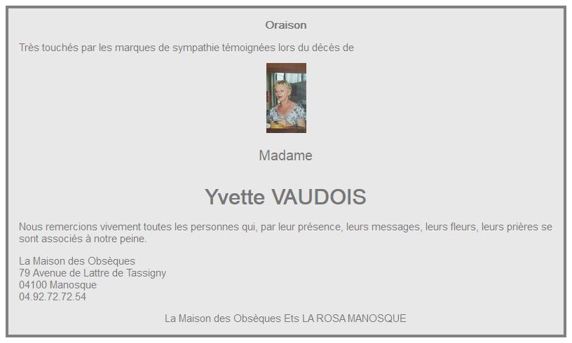 de Madame Yvette BARTOLINI née VAUDOIS