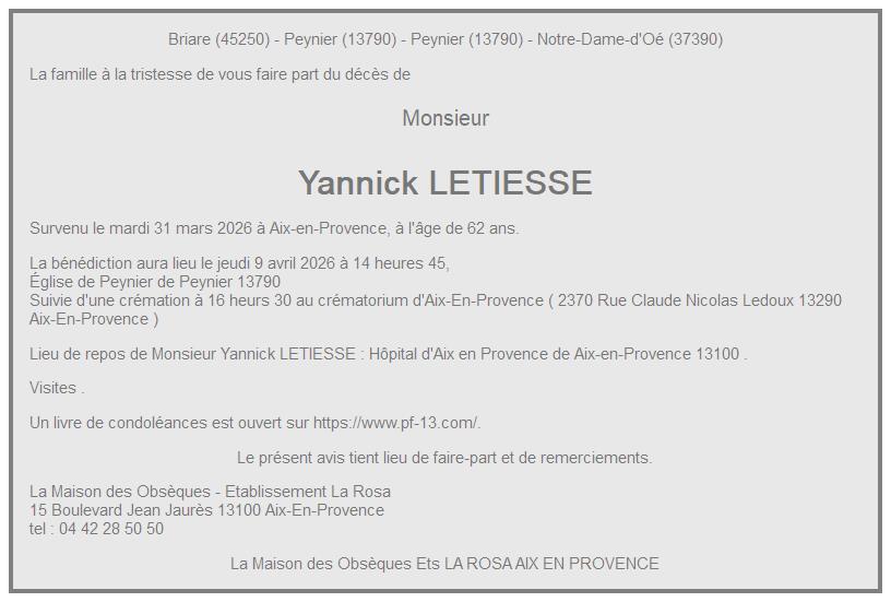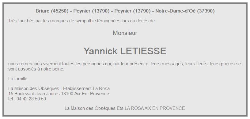 Cet espace « condoléances » est dédié à la mémoire de Monsieur Yannick LETIESSE.