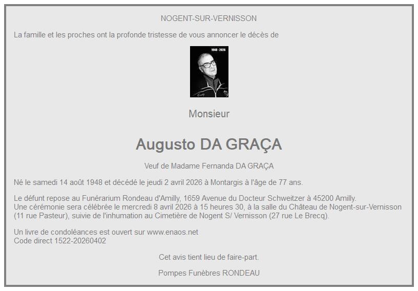 Cet espace « condoléances » est dédié à la mémoire de Monsieur Augusto DA GRAÇA.