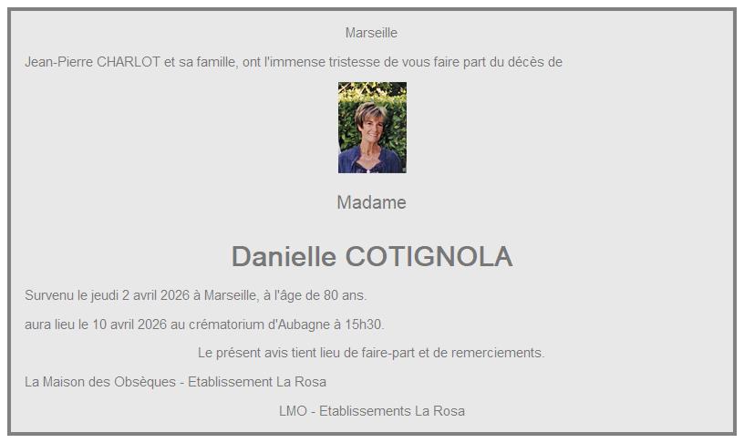 Cet espace « condoléances » est dédié à la mémoire de Madame Danielle Charlot née COTIGNOLA.