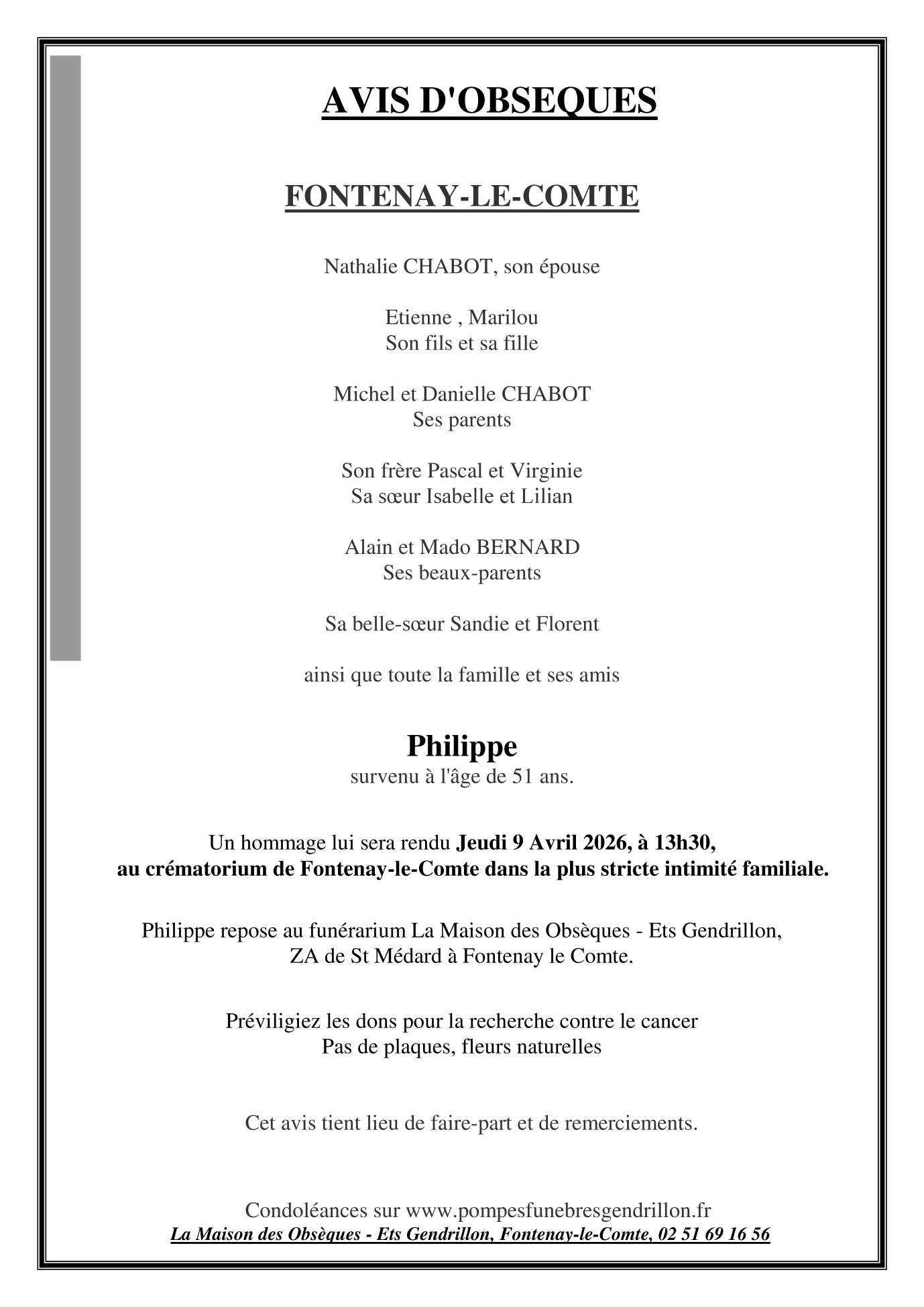 Cet espace « condoléances » est dédié à la mémoire de Monsieur Philippe CHABOT.