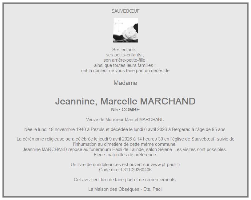 Cet espace « condoléances » est dédié à la mémoire de Madame Jeannine, Marcelle MARCHAND née COMBE.