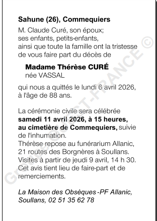 Cet espace « condoléances » est dédié à la mémoire de Madame Thérèse CURÉ née VASSAL.