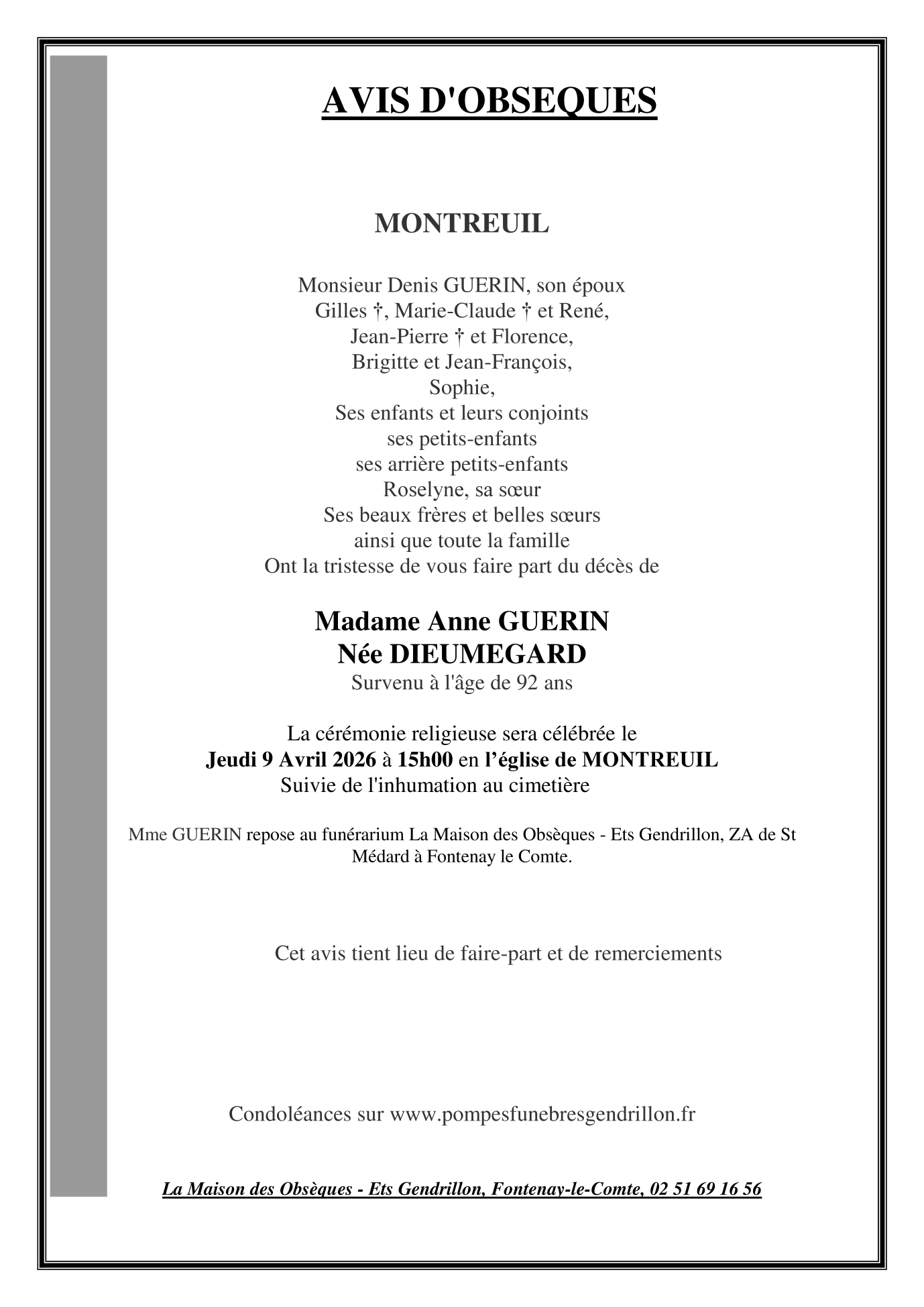 de Madame Anne-Marie GUÉRIN née DIEUMEGARD