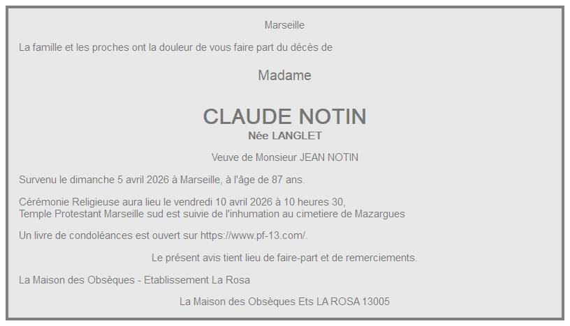 Cet espace « condoléances » est dédié à la mémoire de Madame CLAUDE NOTIN née LANGLET.