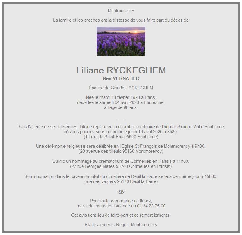 de Madame Liliane RYCKEGHEM née VERNATIER