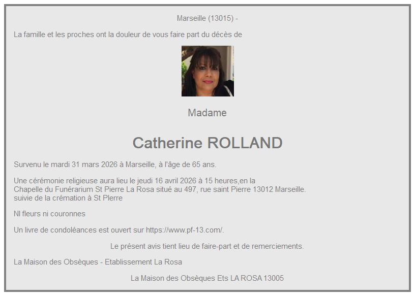 Cet espace « condoléances » est dédié à la mémoire de Madame Catherine ROLLAND.