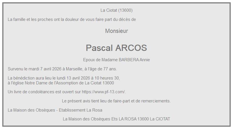 Cet espace « condoléances » est dédié à la mémoire de Monsieur Pascal ARCOS.