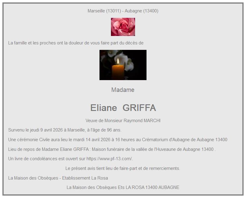 Cet espace « condoléances » est dédié à la mémoire de Madame Eliane GRIFFA.