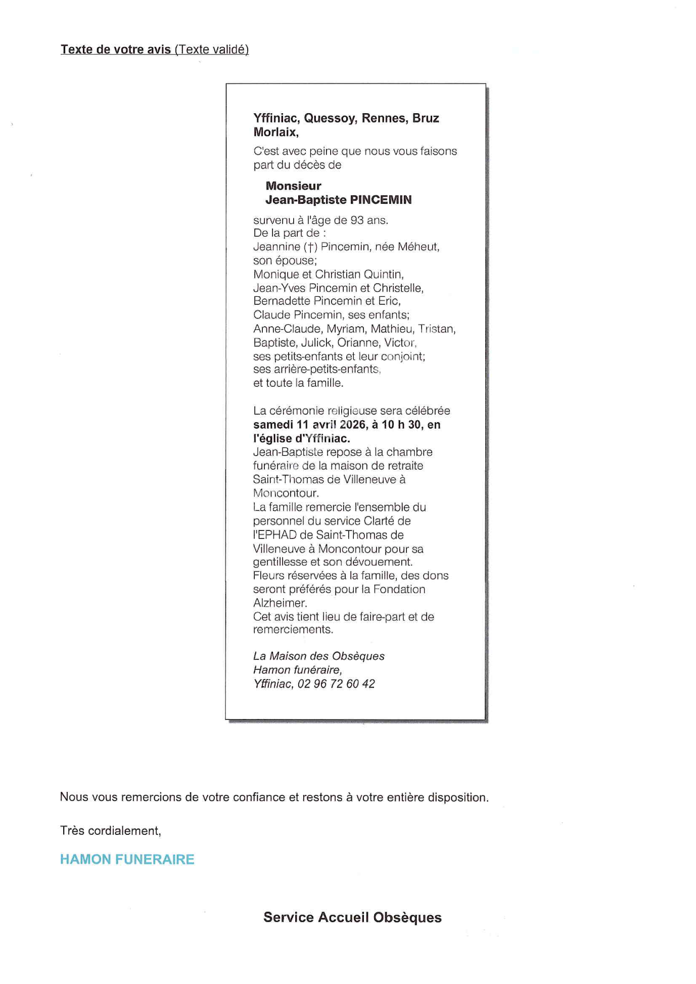Cet espace « condoléances » est dédié à la mémoire de Monsieur Jean-Baptiste PINCEMIN.