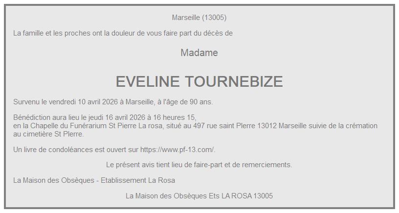 Cet espace « condoléances » est dédié à la mémoire de Madame EVELINE TOURNEBIZE.
