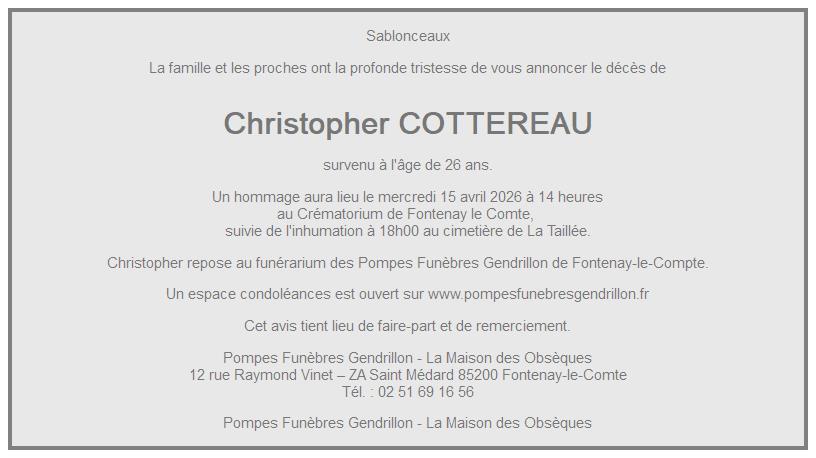 Cet espace « condoléances » est dédié à la mémoire de Monsieur Christopher COTTEREAU.