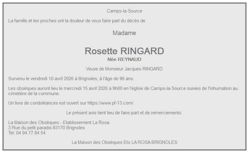 Cet espace « condoléances » est dédié à la mémoire de Madame Rosette RINGARD née REYNAUD.