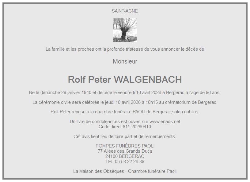 Cet espace « condoléances » est dédié à la mémoire de Monsieur Rolf.Peter WALGENBACH.