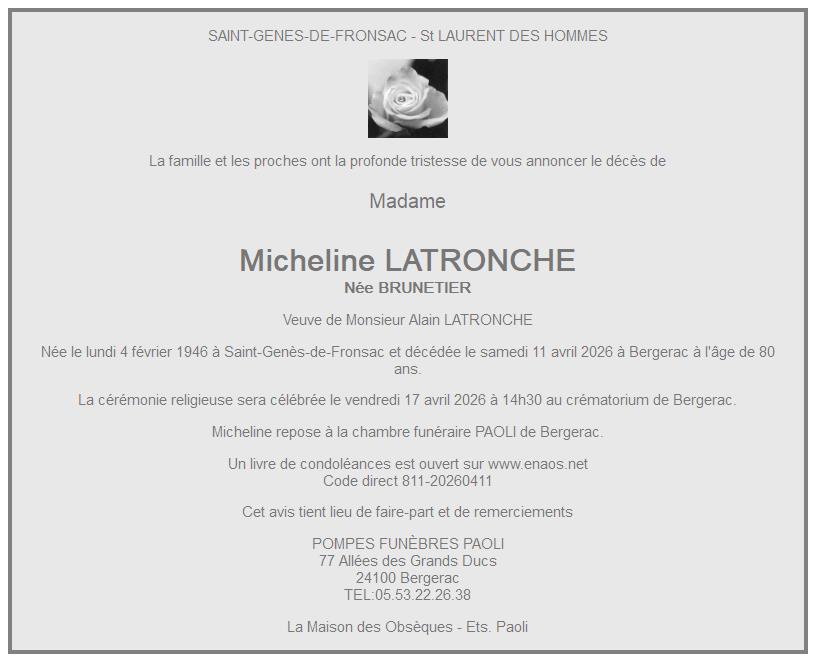 Cet espace « condoléances » est dédié à la mémoire de Madame Micheline LATRONCHE née BRUNETIER.