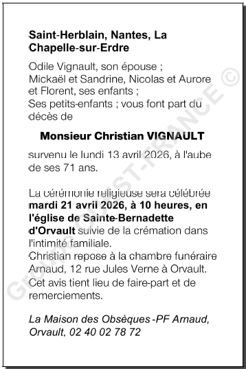 Décédé à Vigneux-de-Bretagne (44360) le lundi 13 avril 2026