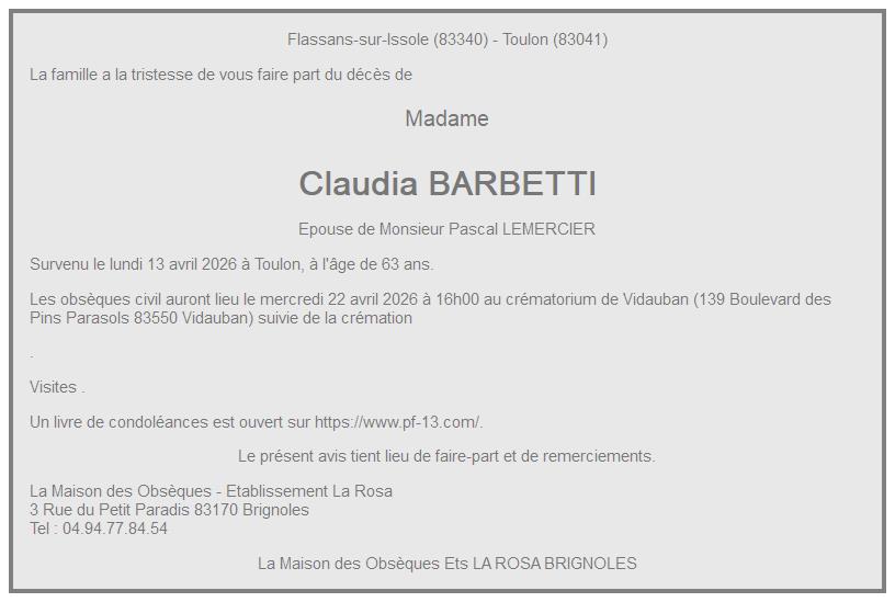 Cet espace « condoléances » est dédié à la mémoire de Madame Claudia LEMERCIER née BARBETTI.