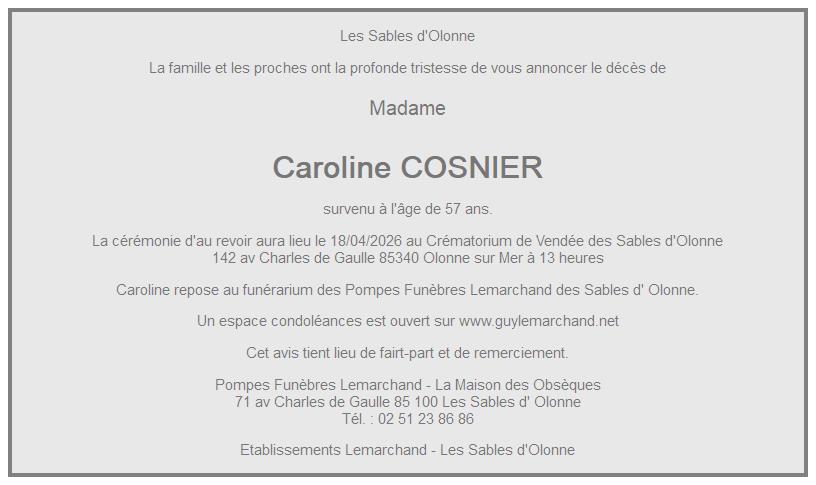 Cet espace « condoléances » est dédié à la mémoire de Madame Caroline COSNIER.