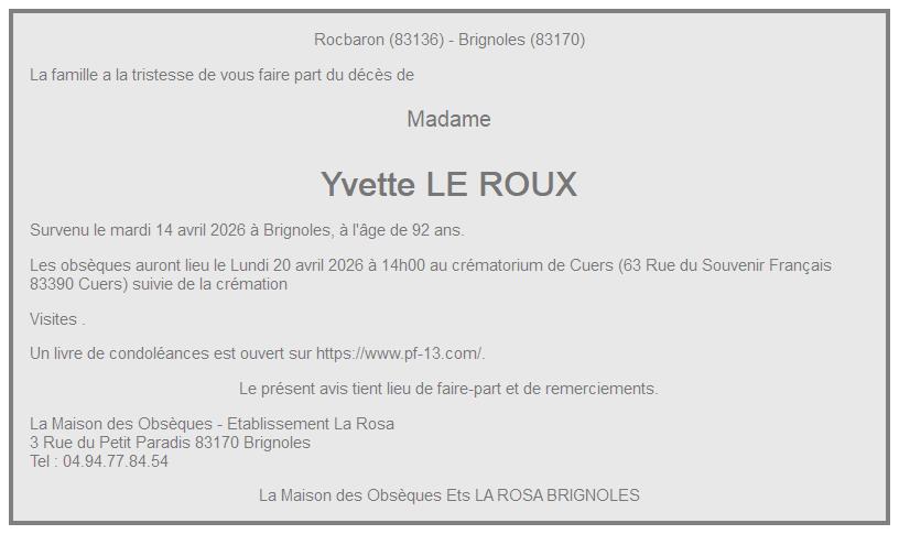 Cet espace « condoléances » est dédié à la mémoire de Madame Yvette LE ROUX.